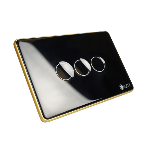 LIÊN HỆ: Công tắc 3 nút (2 chế độ) Lumi chữ nhật dọc kính lõm viền bo cong vàng LM-S3B-CB/CG/DD | Black
